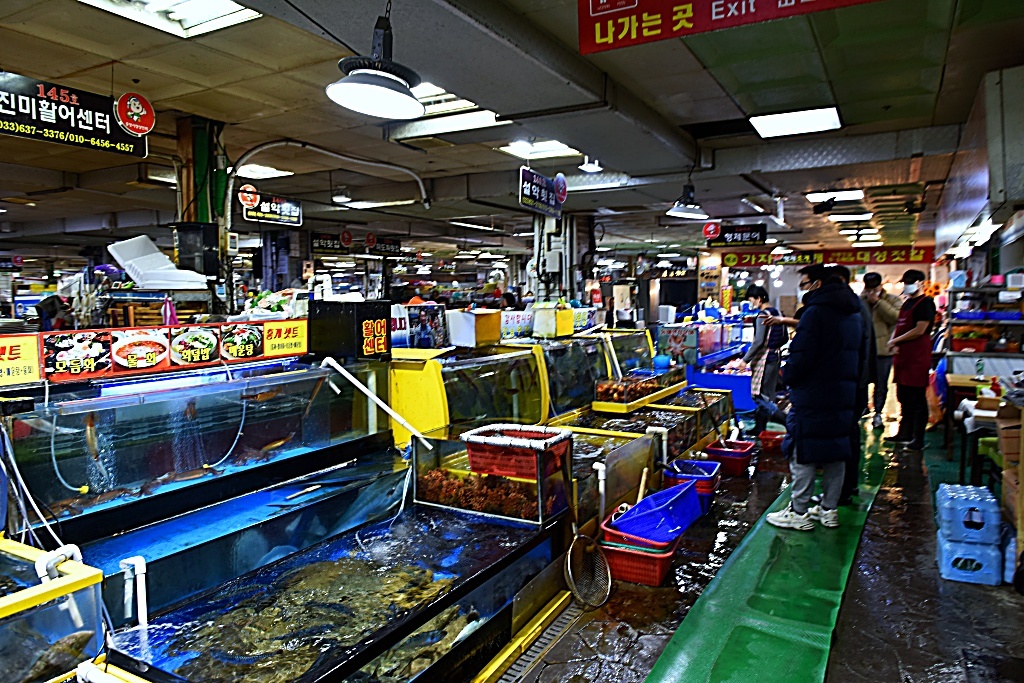 이동하여 지하에 있는회센터에서 점심을 먹습니다.