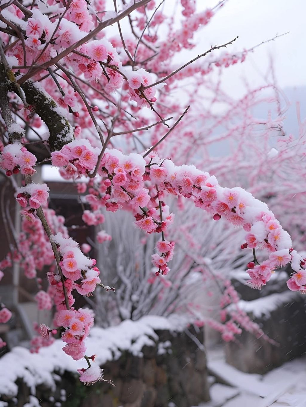 핀 작은 불꽃처럼 빛납니다. 하얀 눈과 붉은 매화의 색조는 더욱 돋보이며, 그 미묘한 색감은 보는