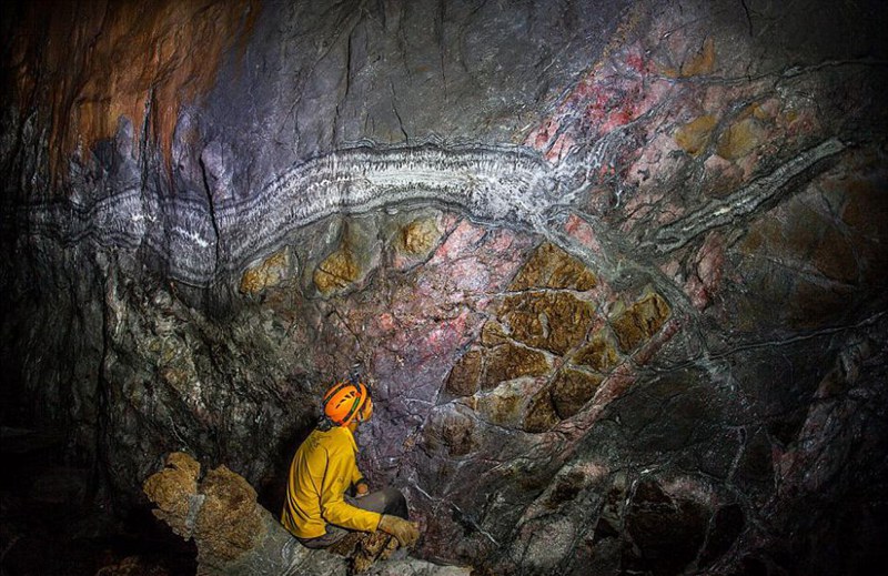 가끔씩 비춰지는 햇빛을 통해 탐험가는 운좋게도 동굴 안의 복잡한 석질구조를 볼 수