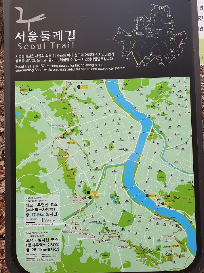 전체 구간의 총거리가 157km인서울 둘레길 4코스인 대모·우면산코스입니다