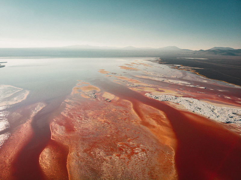 국경과 가깝다. 호수에는 붕사 섬이 있으며, 흰색은 물의 붉은 색과 대조적이다.