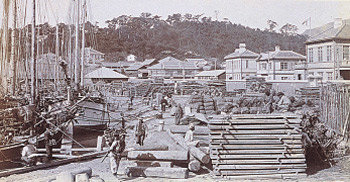 사진은 공사에 필요한 목재를 나르는 장면으로 보인다.