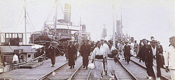 사진은 관부연락선에서 내려 잔교를 건너는 일본인들.