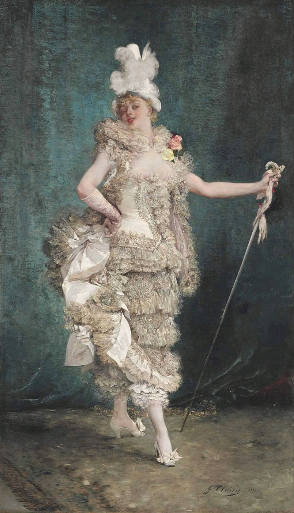 (사라 베르나르)는 늘어진 옷자락이 달린 흰색 새틴 긴 가운을 입고, 분홍색 새틴으로